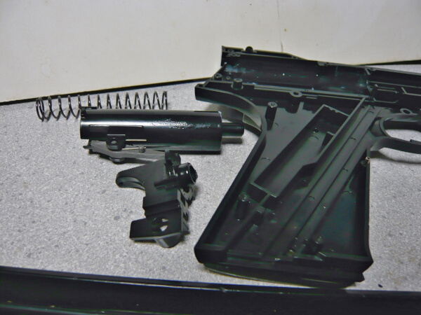 内部機構は至ってオーソドックスな構成。特に凝った部分もありません。ただ、耐久面を考えるとリコイルスプリングガイドの付け根(本体モナカにはめ込まれている部分が1mm程度と細く、衝撃で後端と本体が千切れて分離する可能性が多少・・・)やコッキングレバーが金属パーツで補強されていないなど、若干の不安があります。