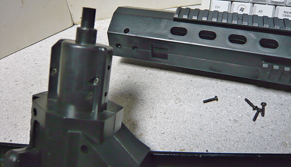 次に、ハンドガード部の右側に見えるネジを全て外してハンドガードを左右に分けます。アウターバレルは予想通りハンドガードの前端に挟まっている部分から前にしかありません。