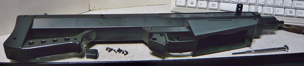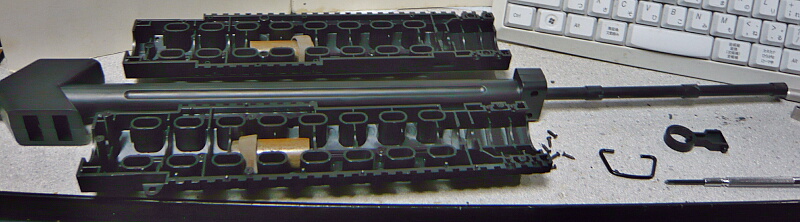 まずはレイルアクセサリーやバイポッド、スリング、マガジンを外しておき、分解にかかります。まずはレシーバーとハンドガード部の間の分割点で前後に分けるため、ハンドガード部後端の上下2つずつ計4個のネジを抜き、ハンドガード部を引っこ抜きます。インナーバレル短けぇ・・・