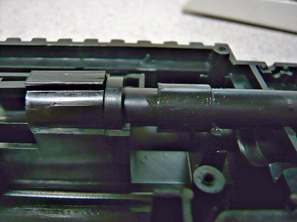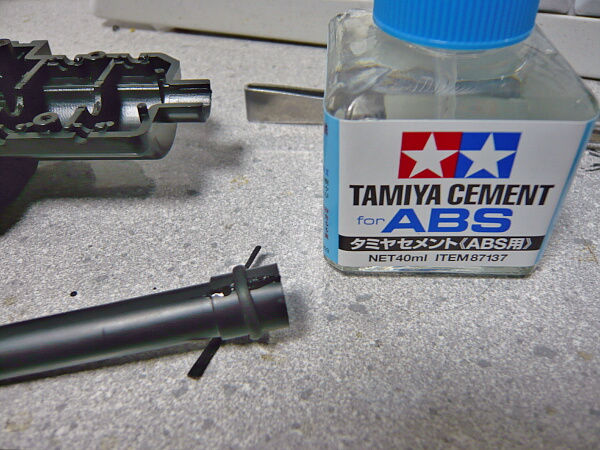 が、ウチにはそんな気の利いた材料は無いのでインナーバレルのつなぎ目を接着し、アウターバレルへも接着して多少の強化をはかります。ぶっちゃけてしまうと実用面のみを考えればハンドガードから突き出したアウター自体ぶった切ってしまうのがいいのですが、ここが無くなると雰囲気が台無しです・・・でもこの銃に飽きて魔改造したくなった時、そんな手もあるでしょう。