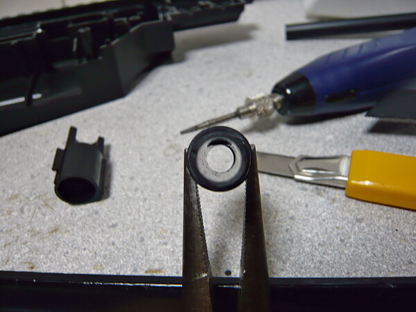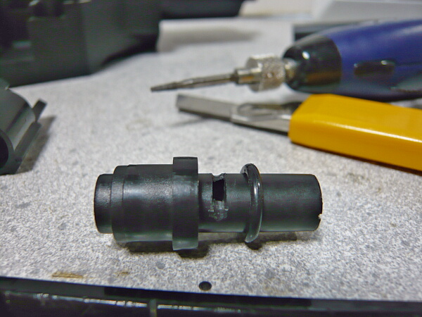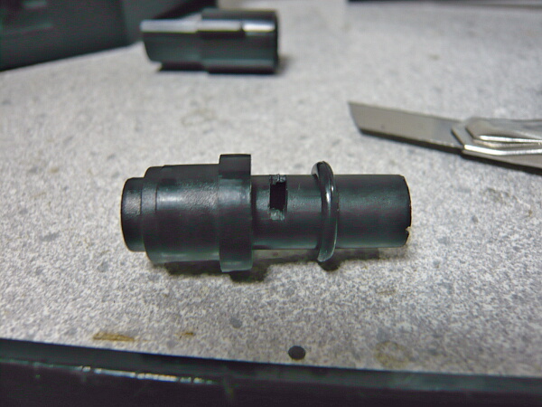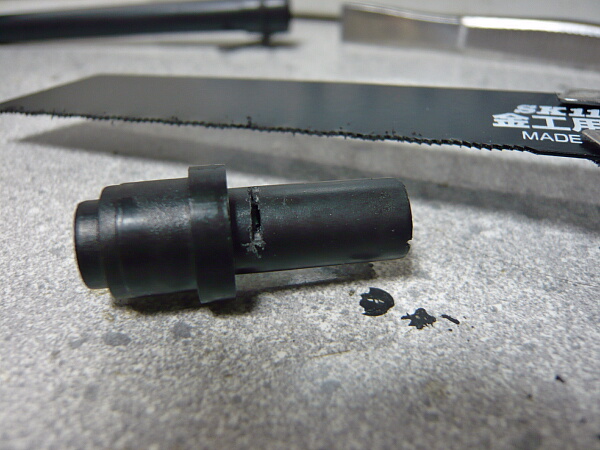 ホップアップの機能を後付けすべく、チャンバー直後のパーツのこの部分にノコギリで切り込みを入れます。