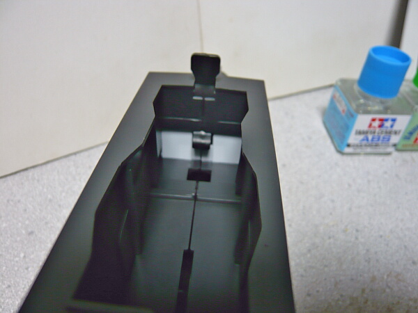 後はパーツを元通り組みたてるだけですが、その前に銃内部に弾が入り込まないよう対策としてマガジンポート内側の前の面の開口している部分をプラ板で塞ぎます。ちゃんとマガジンキャッチの可動を妨げること無く、またBB弾が通れないように。