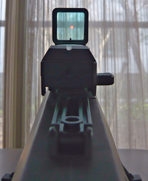 サイトはスコープの上に申し訳程度に付けられた前後サイトなので若干狙いがつけにくいです。片手保持でハンドガンのように腕を伸ばさないとサイティングできませんが、大雑把なサイティングでも良ければストック後端あたりに頬付けして構える事もできます。フルオート射撃しながら射線を目標に向けてゆく方が向いているでしょう。