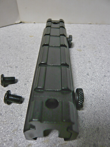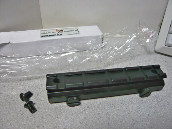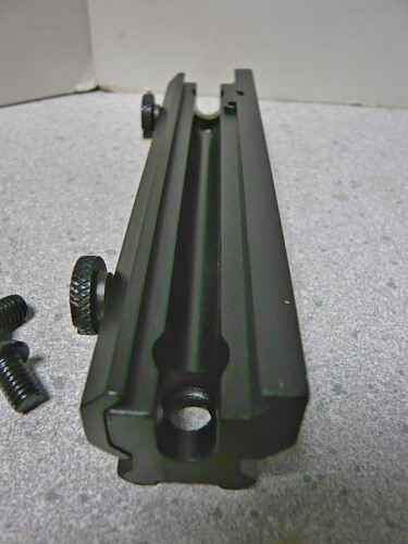 マウント外観。ちょっと角がダルめで色ツヤも好みが分かれるところかもしれません。レイル間隔は片側からもう一方にかけて広くなっていますが、このせいで取り付かないとかはあまり無いかと思われます。もしそうなってもアイデア次第。大抵何とかなります。銃のレイルとこのハイマウントベースとの噛み合いは上写真右の奥の方にある突起が担い、側面に出ているネジは側面のプレートを押さえているだけでレイルの横溝とは関わりません。