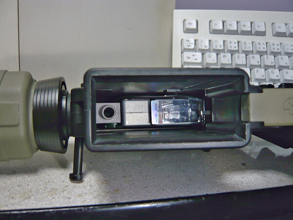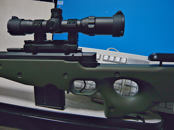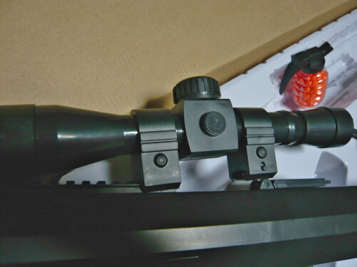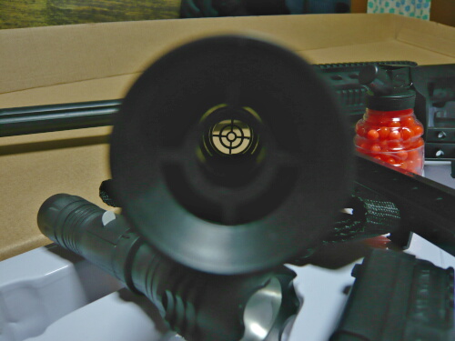 スコープ型の筒。安エアコキだとこれが大事な照準器だったりします。慣れれば案外照準をつけやすいものです。