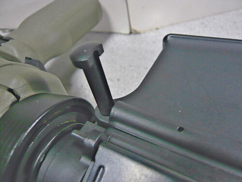 マガジンをカチリと差し込みます。セレクターレバーを上げた位置にしてセーフティ解除。グリップを握った右手の親指で操作できます。マガジンキャッチも実はグリップを握った右手の親指で操作しようと思えばできるのですが、ストックを肩から離し銃口を左に向けてグリップを握りなおさない限りは指が届きません。素直に左手で操作した方が良いでしょう。マガジンに残弾がある状態でマガジンを抜いても弾ポロはしませんがリップ内に弾が溜まってる時がたまにあるので再び銃に挿す前にここに弾が詰まっていないか確かめ、詰まっていたら振り落とします。