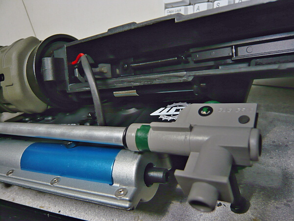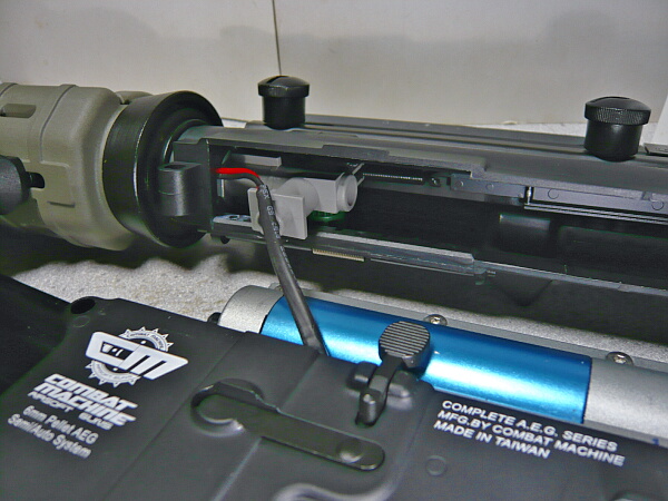 アッパー後端の差込みと前側ピンの周辺の噛み合わせを同時にちょいちょい修正しながらここだ!というところで一気に押し込むとガシッとはまりこみます。一応マガジンポートから覗き込んで配線が変な位置になっていないか確かめておきます。ポート側へダラリと垂れていたらトリガーの方へ押し込んでおきましょう(ハンドガード内に来ている配線側から引っ張っても可)。