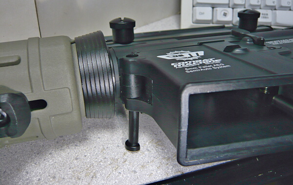 ピンの横には溝が切ってあり、レシーバーに内蔵されたピンで完全には抜けないようになっています。マルイM4はここや後ろ側のピンが振動で勝手に抜け落ちるのがウィークポイントですのでマルイM4クローン系では対策がされているものが多いようです。後ろ側のピンも付け根にOリングがはめてあり抜けにくくしてありました。