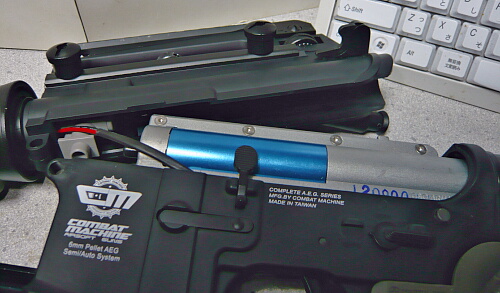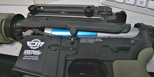 アッパーは本来そのまま前方へずらして抜くのですが、この銃では配線があって数センチずらしたところで止まってしまうのでそこからアッパー後端を持ち上げて左右に開くようにして上へ外します。樹脂レシーバーなのですんなりいきますが金属レシーバーだと無理かもしれません。