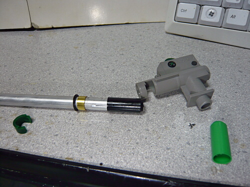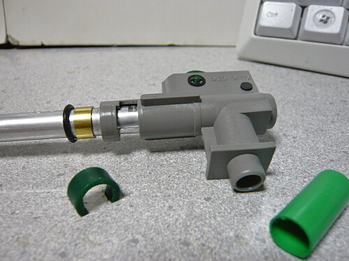 チャンバーとインナーバレルを留めている濃い緑色のパーツを外し、インナーバレルを抜くと真鍮のリングと黄緑のチャンバーパッキンが一緒に抜けてきます。このあたりの構造はマルイと同じ。S&Tタボールも確かこんな感じ。