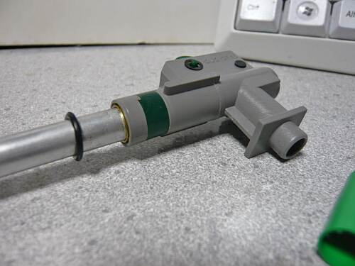 インナーバレルをしっかりとチャンバーへ差し込んだら深緑のロックパーツをはめ、真鍮リングを隙間に差し込みます。ロックパーツがきれいにはまらない時はインナーバレルが刺さりきっていないか、インナーバレルの左右にある溝がちゃんと左右水平の位置になっていません。位置がきちんと合えばロックパーツはきれいにはまり込みます。
