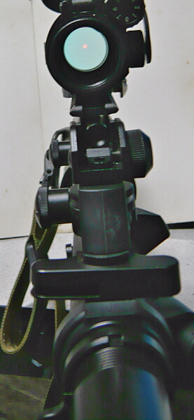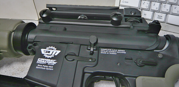 ちょっとどころじゃなく位置が高いですが、M16系は元々この高さなんだよなぁ・・・CM16のレシーバー上面のレイルは樹脂レシーバーと一体であり金属に置き換えていないのでこのドットサイトに標準のハイマウントベースのように1点掛けではレイルを壊しそうな不安があります。