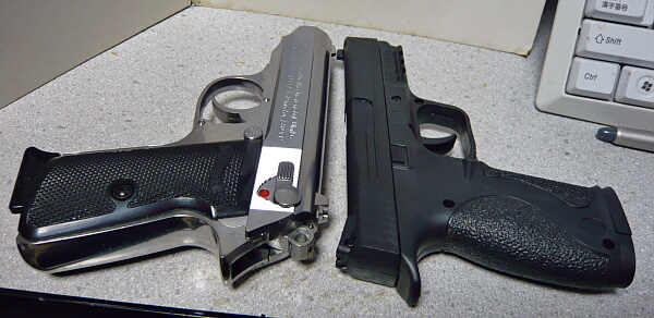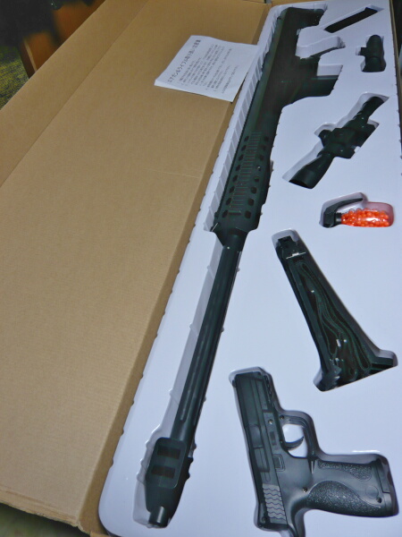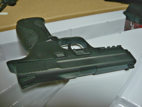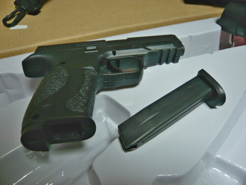 付属の小型エアコキハンドガン。モデルは何だろう?と思って「ポリマーフレーム」でググったら一発で出てきました。S&WのM&P(ミリタリー&ポリス)ですね。