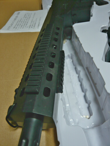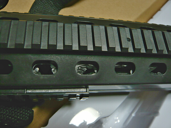ハンドガード部。上下左右にレイルが装備されており一見勝手が良さそうにみえますが、このレイルが実は20mmではないという曲者。ハンドガード部の横穴は左右でトンネルになっているだけで穴から覗いても中身が伺えるようなものではありません。安エアコキによくあるただのモナカがアウターバレルを挟んで固定しているだけの構造。