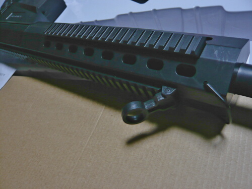 可倒式のフロントサイト。前方水平から扇状に120度ほどの可動域がありますが、ロック位置はありません。フロントサイトの前方には金属製のスリングスイベルがありますがここはスリングを掛けていないとカチャカチャ音を立てがち。スリングを掛けたら掛けたでフロントサイトに触れると角度が変わってしまいます。