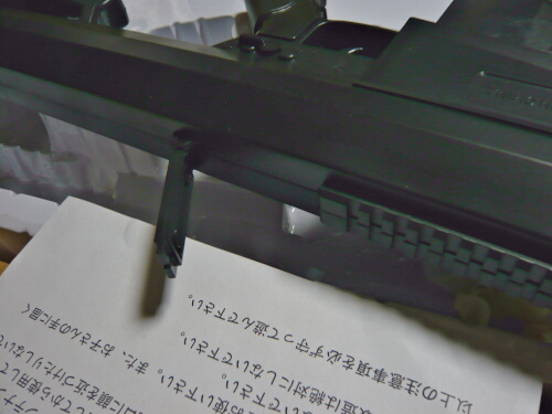 ブリスターから銃を取り出してみると何やらチリチリとBB弾が転げてる音が・・・レシーバー後部に1発ほど潜り込んでる様子。マガジンを抜くと弾がコロコロ出てきました。15発ほど、白い普通な品質のBB弾が入っていました。店で試射した後弾抜き忘れてたっぽい感じ。どうせいずれモナカ割りするので内部構造はその時にチェックするとして、AS50みたく簡単に内部に弾が転がりこむ構造でなおかつ対策のしようが無いとかだったらちょっと困ったもの。幸いコッキングレバーを引ききってもチャンバーにノズルが覗いているのでちゃんとした機構にはなっているようです。