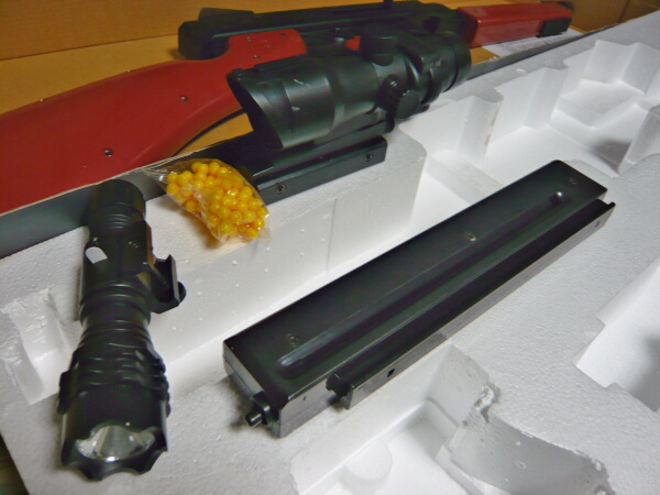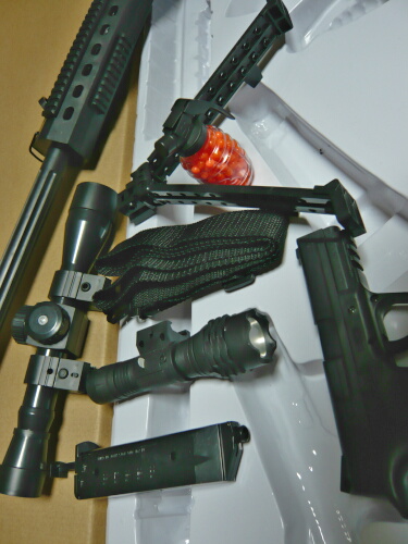 付属品類。スコープ型の筒、バイポッド、手榴弾型のBBボトル中身入り、スリング、ライト、BBローダー、小型のエアコキハンドガン。付属品でハンドガンというのは初めて見ました。