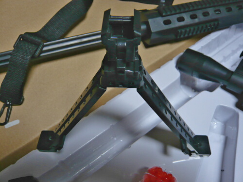 バイポッドは足の剛性が足りずたわむのでこの銃でもギリギリなレベル。可動は左右へは歯車で連動していますがスプリングは無いので自分で開いてやる必要があります。前後へは垂直から一方へ90度。ハンドガードにこのバイポッドの突起を引っ掛ける穴があるので基本後ろ方向へ畳む取り付けになります。この銃付属のレイルアクセサリーはレイルに掛ける部分のモナカが開きやすく強い力がかかるとレイルから外れやすい傾向にあり、このバイポッドもあまり手荒に使えるようなものではありません。そっと、そっと。