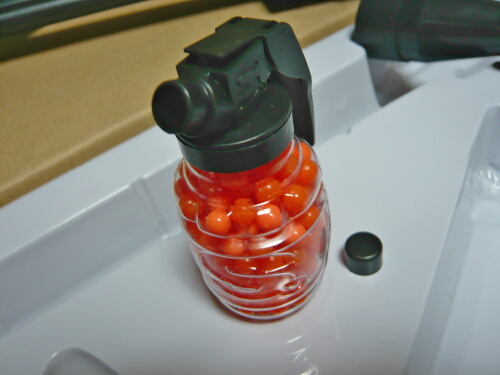 手榴弾型のBBボトル。握るようにしてレバーを倒すと出口の突起が持ち上がって開く構造。面白いですが小さくて容量が少なく、ポケットなどに入れておくとレバーが倒れて弾がだだ漏れになるかも。中に入っているオレンジ色のBB弾は品質がゴミレベルなので絶対に使ってはいけません。
