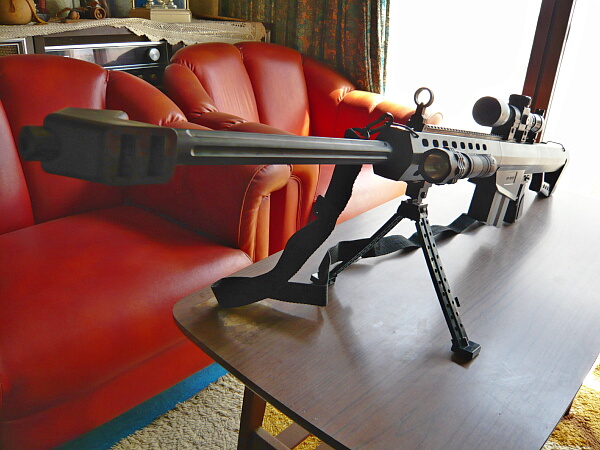 さて話を本体であるバレットに戻しましょう。全長は前述の通り105cm。フルサイズのM14と較べたら若干短いですがかさ増ししたAS50よりは明らかにデカイのはお分かり頂けるだろうか。M14に対するルガーミニ14のように、オリジナルのバレットM82A1に対するミニバレットといったところか。
