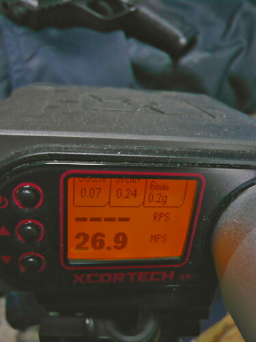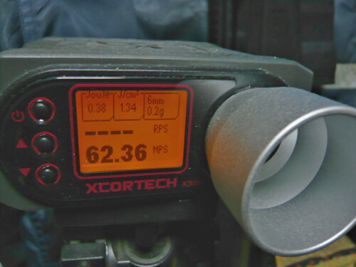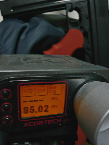 初速は長い銃なので中々大変。うまく弾速器へ真っ直ぐ弾を通すのに苦労します。出た数値は60~68mpsといった具合で、たまに55mps程度を出す時がありバラつきがあります。まだアタリが出ていないのかも。