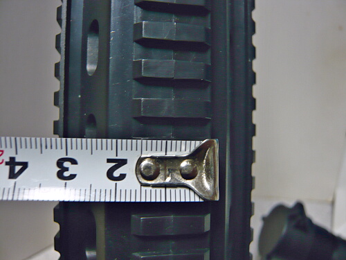 で、レイルに手持ちのドットサイト載せて撃ってみようと、レイルに掛けてみたら固定できない!レイル幅を計ってみたらBOYSばりに18mmほどしかありません。横方向の溝幅、山幅は共に5mm。