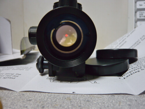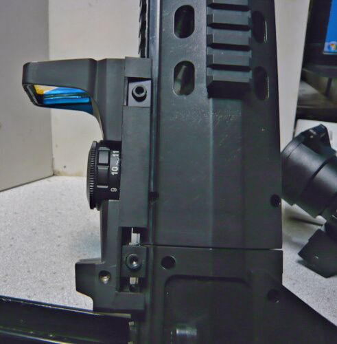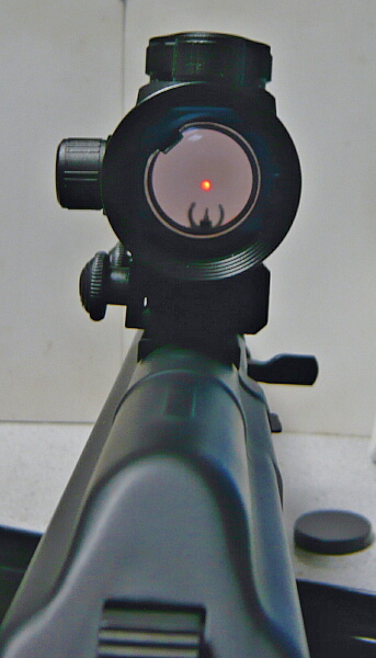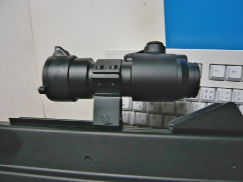 銃への取り付けはレイルの端から差し込むのですが、リヤサイトが邪魔でちょっとコツがいります。前側を差し込んでからちょっと左右にゆすってやるとモナカが開いてルーズになるのでそのままスコープを後ろからトントンと叩くようにして前へ進めていくとどうにか入ってゆきます。後ろ側のマウント部分にはスプリングで下方向へテンションの掛かっているロックスイッチがあるのでスイッチを引き上げながら任意の位置まで差込み、スイッチを離してロックさせます。