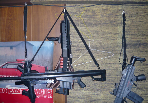 カバーが無いドットサイトを載せたらレンズにホコリが付くし立てて置けないので付属のスリングで水平に吊って保管になりました。部屋の中でスゴイ存在アピールしてますコヤツ。