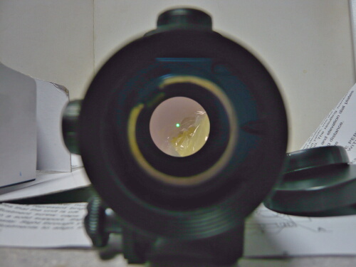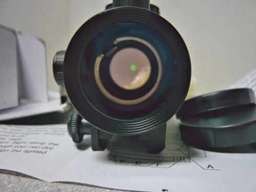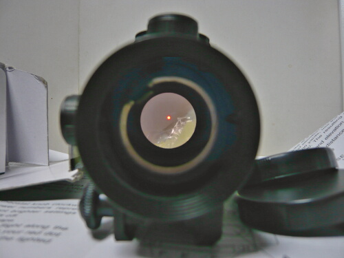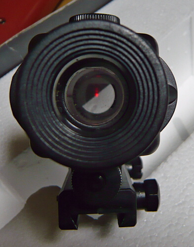 ACOGは何か見覚えのあるブツ。後面下側にボタンがありここがON/OFFスイッチになっています。ドットは対物側レンズが曲率もミラーコートも無いただのガラス板なのでただ投影されるだけですが、一応ACOGらしく十字架型になっています。でも暗い・・・