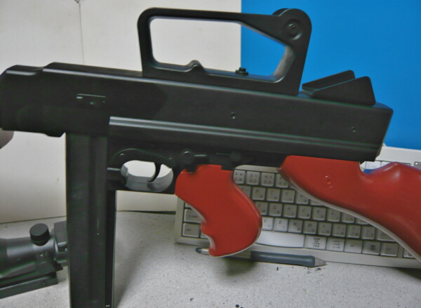 リヤサイトは、ありません(!)。一枚の板をU字に曲げたような形の左右のカバーはあるのですが、その間には何もありません。本来トンプソンM1A1のリヤサイトは一枚の鉄板をU字型に曲げたもので、更にその中央部をコの字に切って90度上に折り曲げて立て、その立てた部分に穴を開けただけの超簡素なつくり。金属プレスだと打ち抜き一発で成型されちゃう形状のものです。しかしこの銃には無いので、このままではサイティングができません。レシーバー上面にはレイルがありますが横方向の溝が無く、汎用性の無いタイプ。更に重箱の隅をつつくなら、その前方の右角にあるべき排莢口もありません。