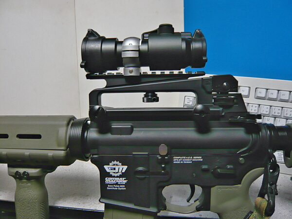 G&G CM16に装着していたキャリハンマウントの上に載せてみました。雰囲気としてはM16スコープっぽい感じ。
