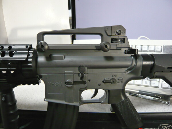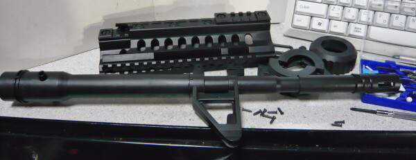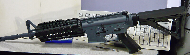 ハンドガードとストックを取り付け。ハンドガードは上下を逆にするとレシーバー上に掛かるレイル延長部分が取り付かなくなりますが、代わりにハンドガード下側のレイルがマガジンポートギリギリの位置まで来るのでフォアグリップの取り付け位置の自由が効くようになります。レシーバー上にあったレイル延長部分はリヤサイトが無く、後付けするとフロントサイトと高さが合わなくなるし、ハンドガードとは剛結されないので首の強化にはあまり貢献していない感じ。撤去してキャリハンや後付けリヤサイトに置き換えたほうが良いでしょう。