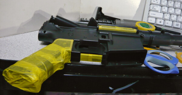 グリップとトリガーガード、ポートカバーとボルトストップをマスキング。ボルトフォワードアシストノブは単純に忘れてました・・・ピン部分などはマスキングせず後で黒に塗ります。