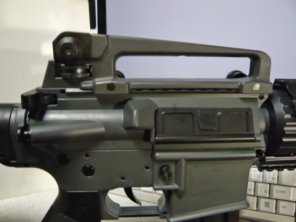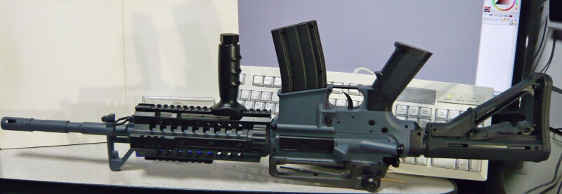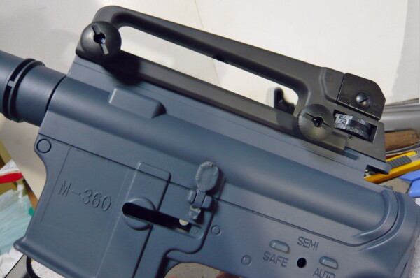 残りのパーツを取り付けて完成。ガンシップグレイはちょっと青すぎてマルイM4のキャリハンの色とはチグハグですが、M4のレシーバーはたまにこんな色に撮影されてる写真もあるし・・・と自分に言い聞かせておきます。