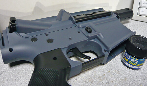 レシーバーとアウターバレルを一旦結合し、ガンシップグレイを吹きつけ。塗装は簡単で、キレイに乗ってくれます。乾燥も速め。つや消しの風合いも中々良い塗料ですが、思ってたより随分青い・・・