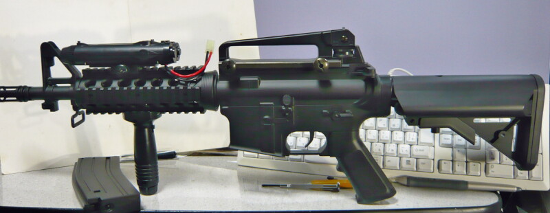 まあいいや、という事で組み上げます。インナーバレル付け根に巻いてある緑色は輪ゴムでホップアップ改造の証し。このM4Sシステムは2580円だったっけ?ホップアップを後付けすれば元々初速はかなり出ているのでそこそこ使い物になるお買い得品。
