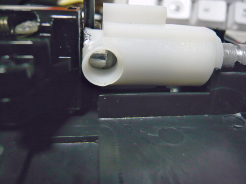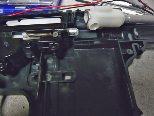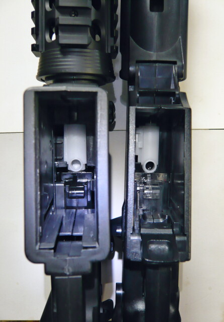 セミオートで空撃ちするとノズルの止まる位置が一定ではありません。これはバッテリーの電圧が高い場合に大抵の電動ガンで起きるのでここは仕方無いのですが、問題は飛距離が全然出ない事。これはチャンバーの気密がスカスカでエアの大半が他へ漏れていると推測されます。マガジンポートからのぞいてみてもやはりメカボックスとチャンバーの間に結構な隙間が開いているし、やはりそう簡単にはいかなかったか・・・