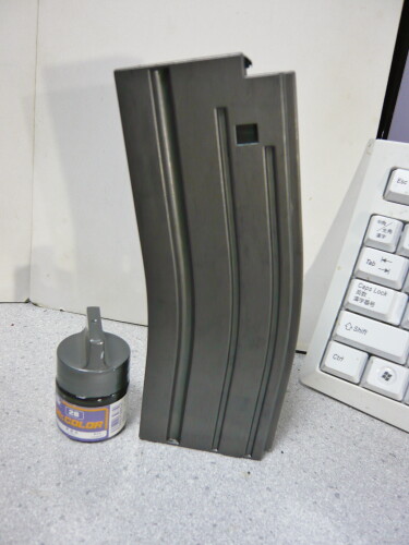 マガジンも明るく調色した黒鉄色で塗装。この写真だと良い風合いですが実際にはマルイM4標準マガジンよりかなり明るい色です。