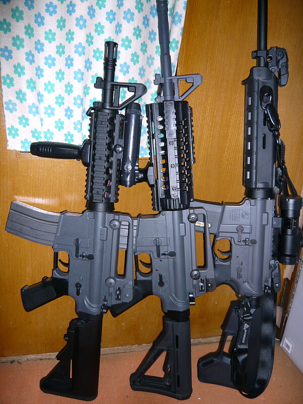 左からBOYI M4CQB、中華エアコキM4Sシステム、マルイスタンダード電動M4A1。