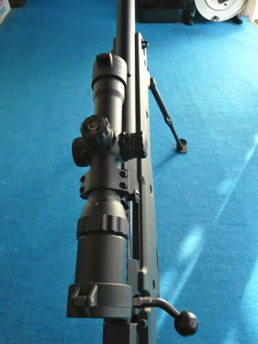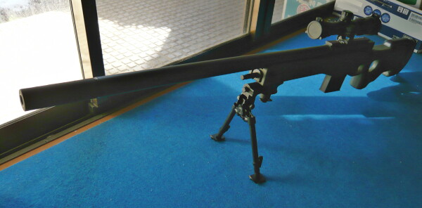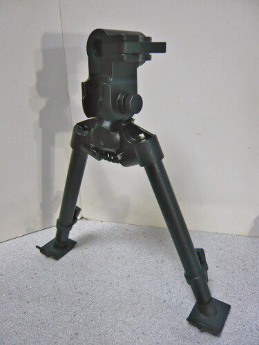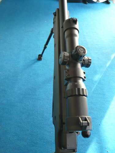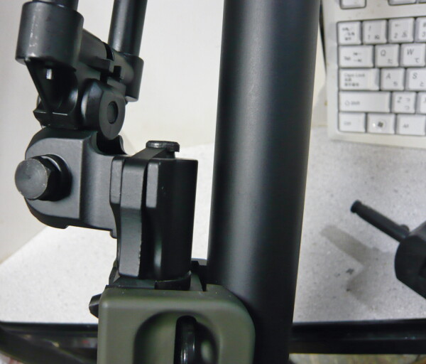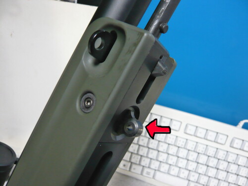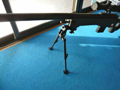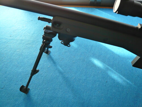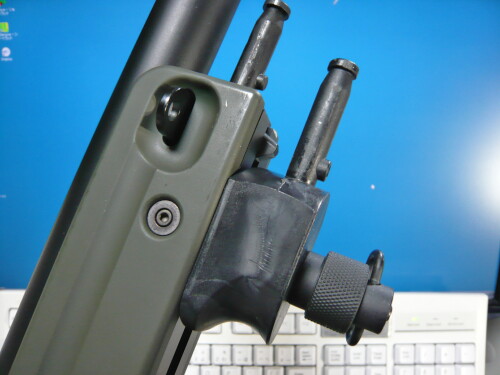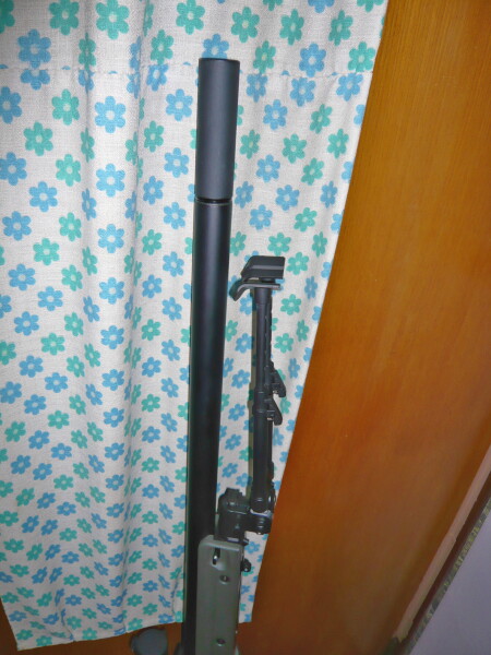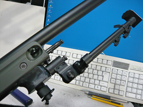 バイポッド本体を差し込んで出来上がり。畳んだバイポッドが銃身と離れてて一体感が無いと思うでしょうが、標準装備のロッドを利用して装着した場合銃身へ足がガシガシ当たる傾向にあるのでこのくらい離れてた方がむしろ精神衛生上良いのかもしれません。また前述の通りバイポッド一式が750gほどあるので装着状態ではかなり前方が重くなります。スコープ込みで銃の重さが4.7kgくらいになります。