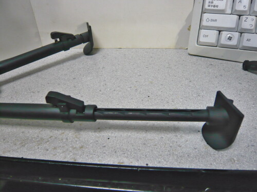 マルイL96に付けるバイポッドというと純正オプションとも言うべきタクティカルバイポッドがありますがあれもこれと同様ベルサタイプと呼ばれるもの。銃に標準装備または後付けのロッドに差し込んで装着するようになっています。2本の足は左右に展開している状態から中央へ束ねるようにしながら前方へ曲げると折りたたむ事が出来ます。