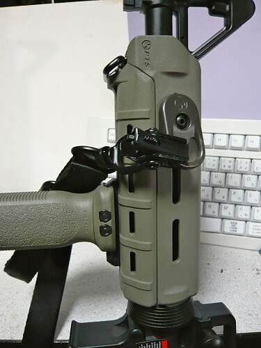 とりあえず標準で付いていたスリングスイベルをフロントサイトの前に取り付けてスリングを装着。アウターバレルに傷を入れながらクルクル回ったり前後にズレたりするので精神衛生上良くない感じ・・・