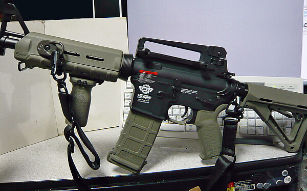 G&G・CM16はレシーバーが真っ黒なのでフォリッジグリーン(FG)で揃えてたパーツの色彩が引き立ちます。MS2スリングとMSA以外はレプリカじゃなく高いMagpul PTSのパーツ。