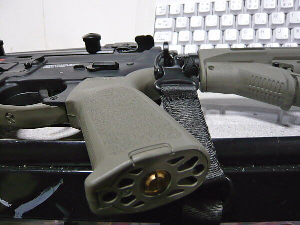 MIADグリップキットというとグリップの前後が分割されていて形状を選べるようになっているものなのですがこれは一番大きい形にした時のMIADグリップキットの形状を模しているだけで分割はされていません。ガッカリ?いやいや。安いレプリカがそんなところを完全再現していたところで分割部分がギチギチ動いちゃうだけです。前後に細いのが欲しいならマグプルMOE-Kグリップでいいしフィンガーチャンネル要らないならMOEグリップでいいでしょう。前後に大きくてフィンガーチャンネルも欲しいならコレか6千円くらい出してMagpul PTSのMIADグリップキット。