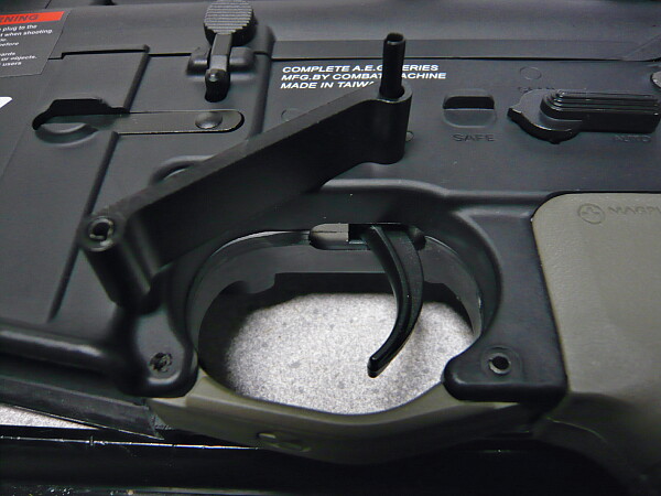 Magpul PTS MOEトリガーガード(AEG用)もポン付けが出来ますが、標準で付いているトリガーガードは前側がスプリングピンを突っ込んで留めているためにそのままではピンを抜く事が出来ないと判断してレシーバーの塞がっている側をドリルで穴を開けて貫通させてしまいました。ピンの長さはトリガーガードの幅しかないので穴の開いている側からピンをトリガーガード内に叩き込んでやれば外せた様子。マルイのM4はスプリングの入ったボタンになっており爪楊枝を突っ込んで押してやるだけで前側は外せます。MOEトリガーガードは付属のイモネジでの取り付け。
