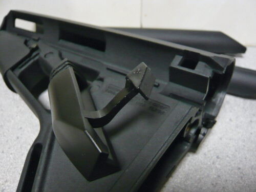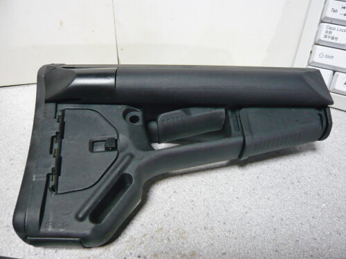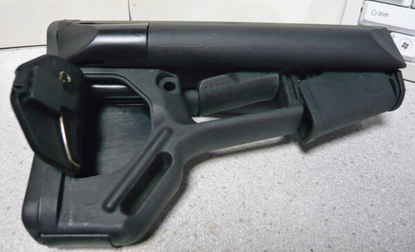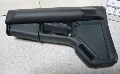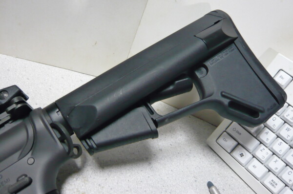 レバーを握ってスコンといっぱいまで伸ばしたところ。少々ガタはありますが許容範囲かと思います。Magpul PTSのACSカービンストックはCTR同様かなり削らないといけないようです。苦労無くとりあえず付けばいい、という人はレプリカを、手間掛かってもガッチリさせたい人はMagpul PTSのものを買うと良いでしょう。税込み定価17640円とお高いですが・・・