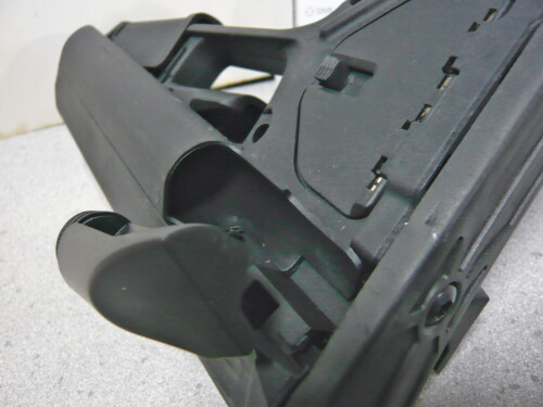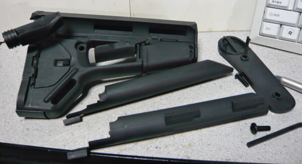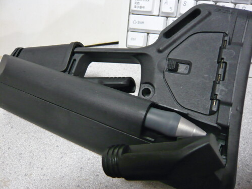 右側のドアを開けたところ。物を入れてもカラコロ音が出がちなのでビニールの小袋に入れるなど工夫すると良いでしょう。ここにはストック着脱用工具(このレプリカには付属しませんが、Magpul PTSのものには付属します)や六角レンチなどを入れておくと便利でしょう。ストック前半のフリクションロックは可動はしますがMagpul PTSのCTRカービンストックのもののように動作はしっかりしておらず、割とブラブラしていて機能はしていません。ただ形状は一応機能させられそうな雰囲気はありますので分解して調整すれば機能させられる可能性はあります。