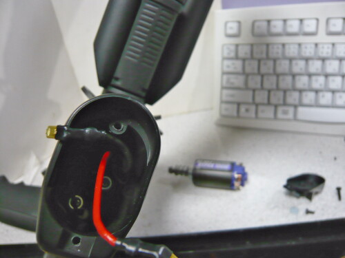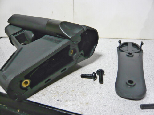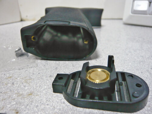 グリップ底のプレートを被せたところ。モーターに付いているスプリングでモーターごと持ち上がっているのでまだ浮いています。