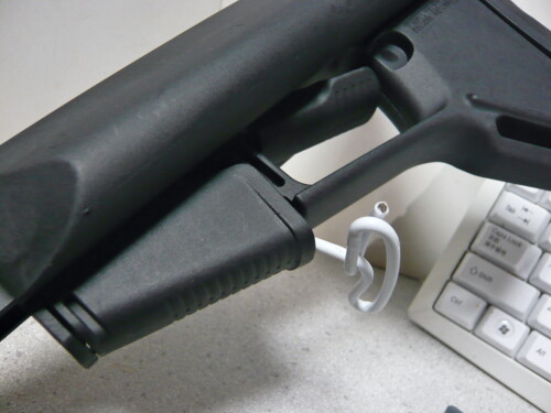 それでは装着です。レバーを握るとフリクションロックが開いて隙間に現れるロックチューブ(仮称)が下がってくるので太い針金を曲げて作ったストック着脱用工具を引っ掛けます。