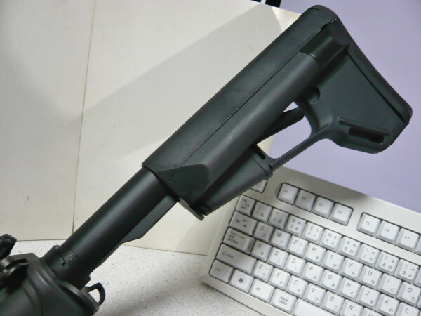 マルイのスタンダード電動M4へ装着したところ。いっぱいに縮めたところのロックがやや甘いですが、実用レベル。渋さは無く抵抗なく差し込む事ができます。G&GのCM16にも装着できますが、一番縮めたところではロックできませんでした。
